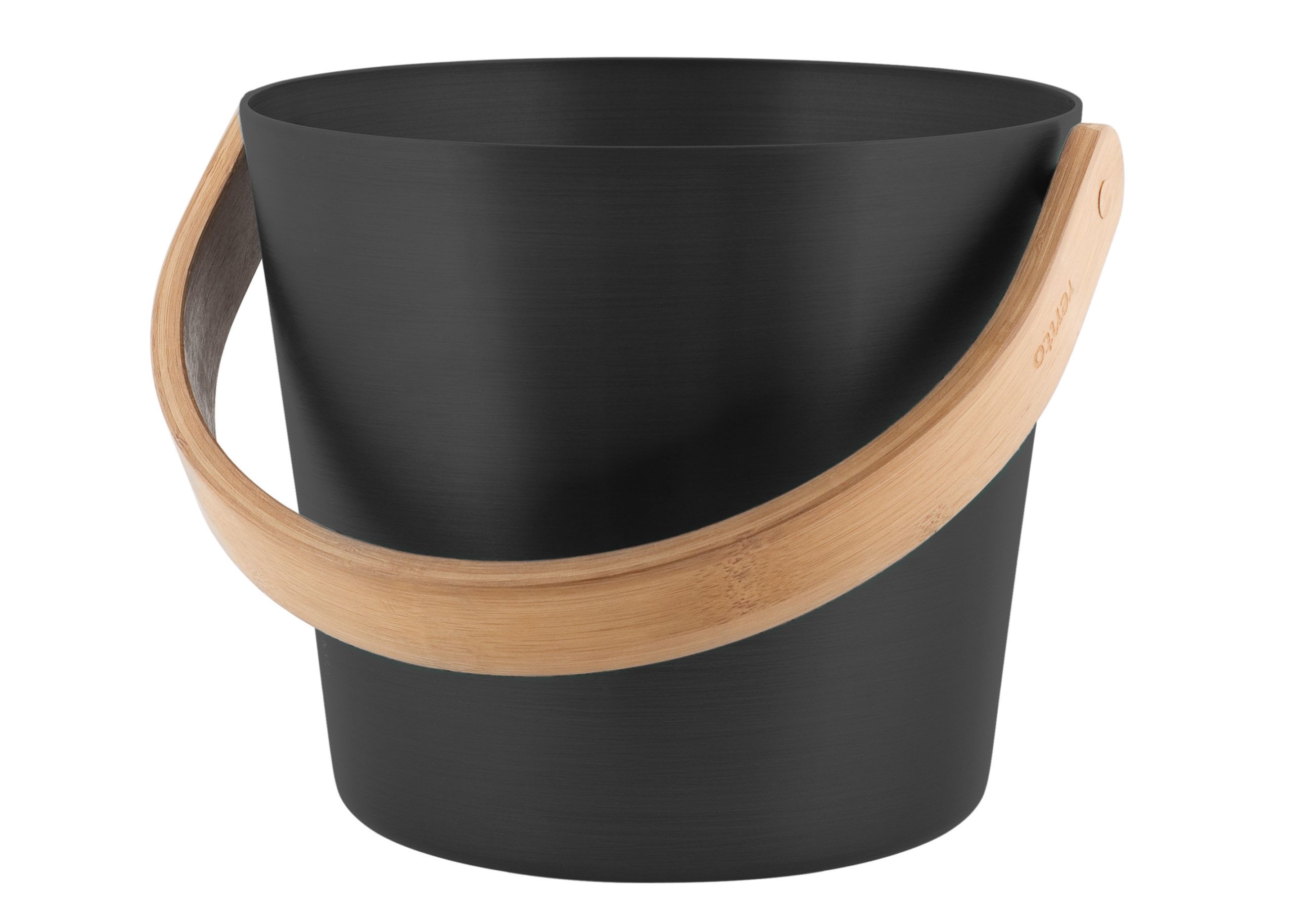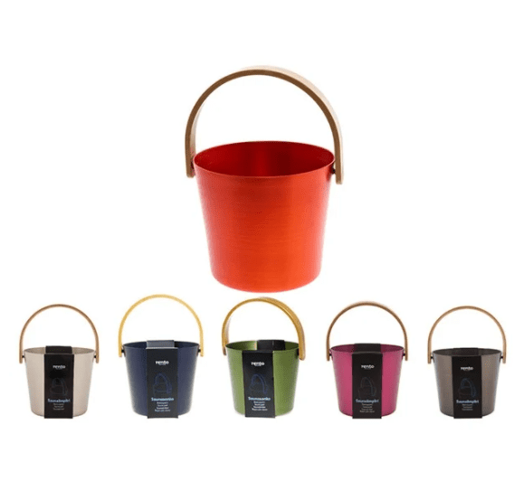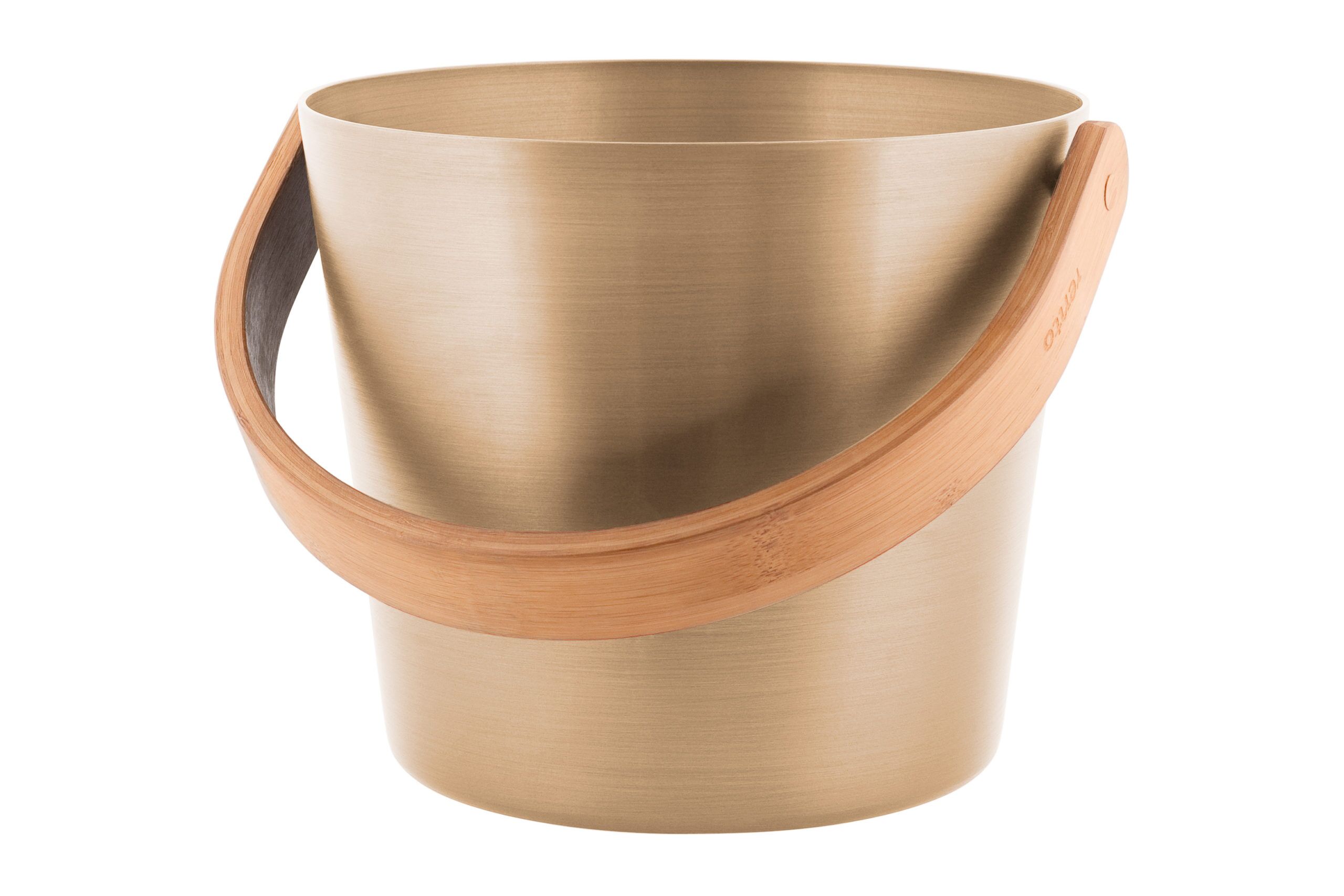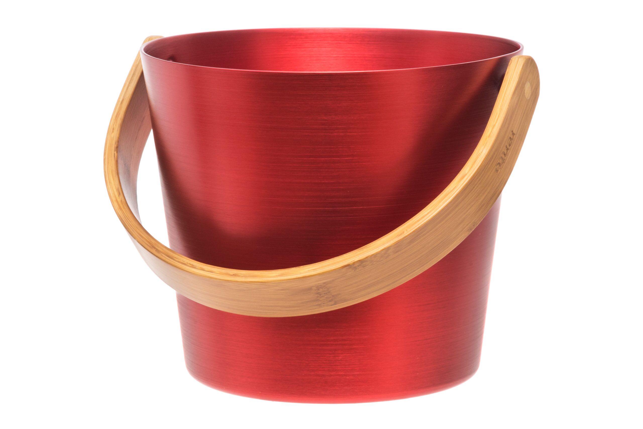 Color-anodized aluminum bucket with heat-treated bamboo curved handle.